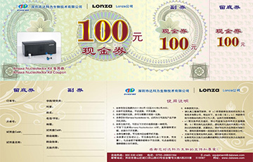 從2011年3月1日起,達科為公司Amaxa轉染試劑盒推出送禮活動,凡購買25Test轉染試劑盒均贈送一張100元現金券(以此類推,多買多送), 具體使用方法見上圖現金券,咨詢熱線:800 830 4366 電話:0755-26410427 26650164